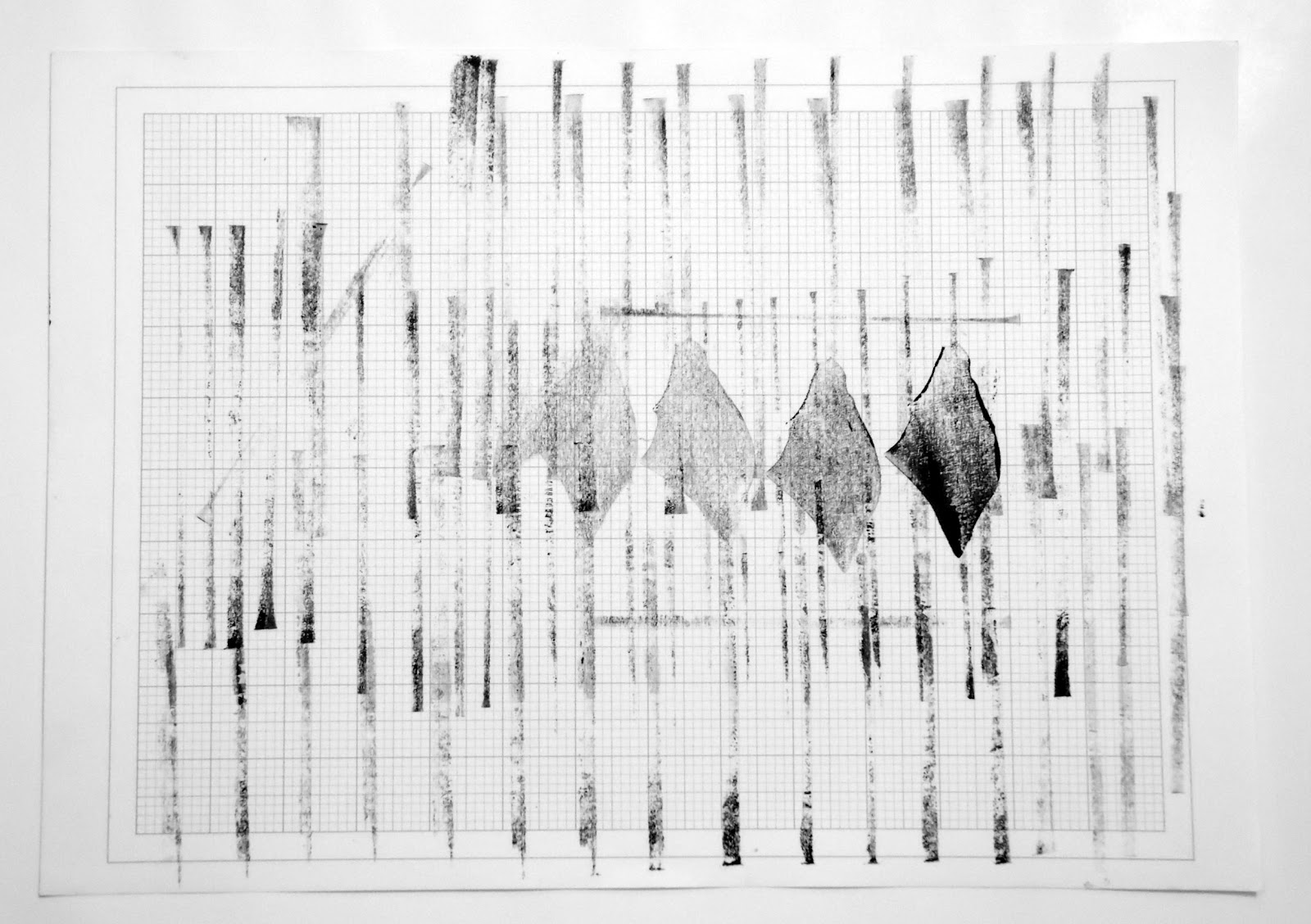 Prints from 7-inch records using black block printing ink on A3 graph paper.